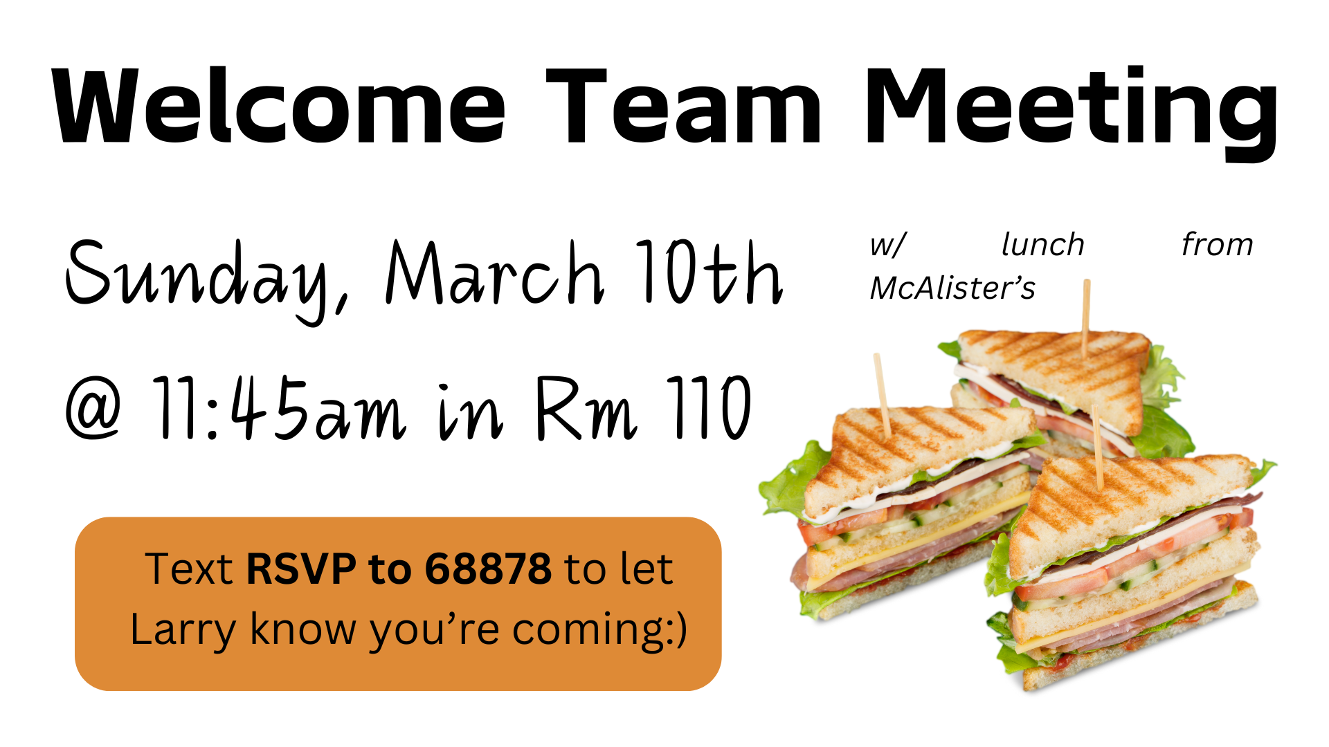 On Sunday, March 10th, we’ll have a short “info” meeting during lunch for you (and your family) in Room 110 to go over a few “Welcome Team” things.